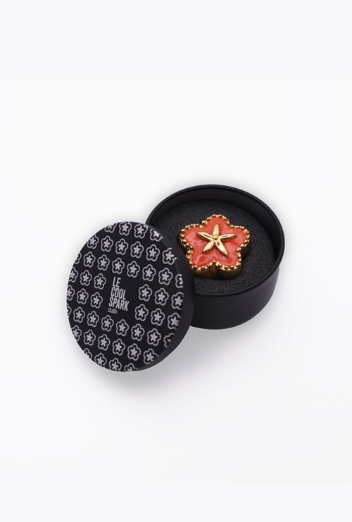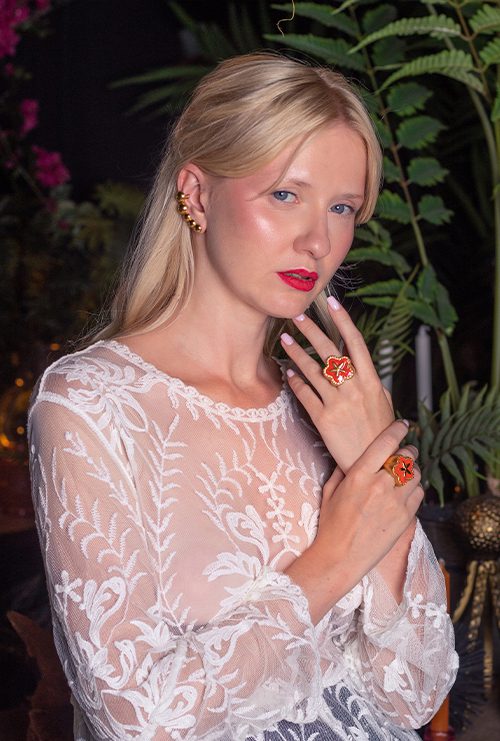 Un diseño robusto y con presencia, que combina fuerza y delicadeza. Este anillo presenta flores talladas a mano, bañadas en 4 micras de oro de 24 quilates y esmaltadas en un delicado tono coral, evocando la belleza de la naturaleza.