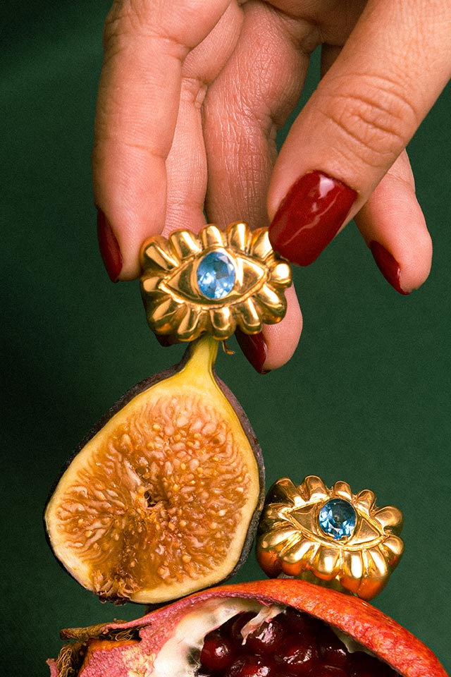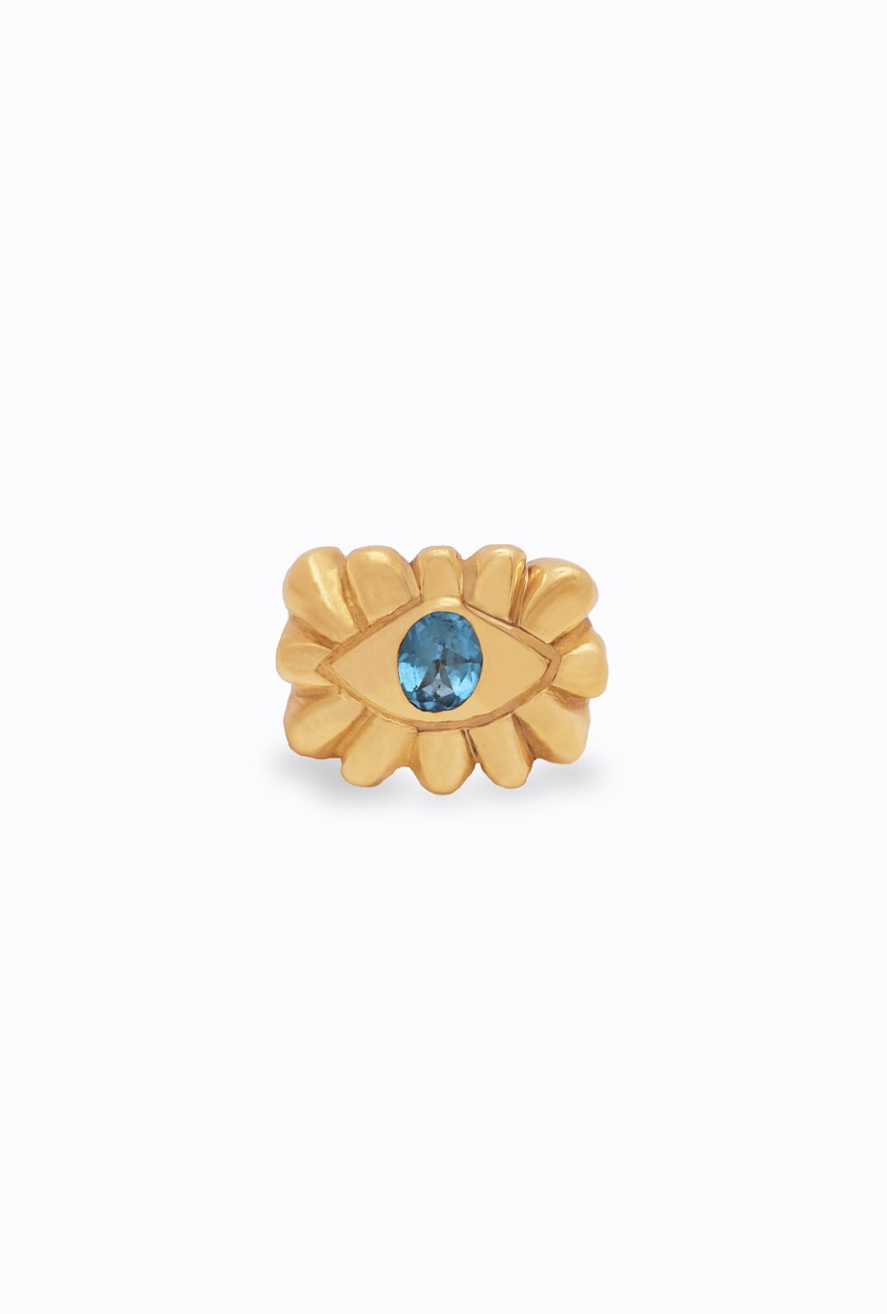 Inspirado en el universo mágico de Alicia en el País de las Maravillas, el Anillo Oráculo está tallado a mano y bañado en oro amarillo de 24 quilates con un espesor de 4 micras. Su diseño en forma de ojo simboliza la intuición, la visión interior y la sabiduría. En el centro, un topacio Swiss de 7×9 mm evoca la mirada que percibe más allá de lo evidente, revelando lo enigmático y lo inexplicable.