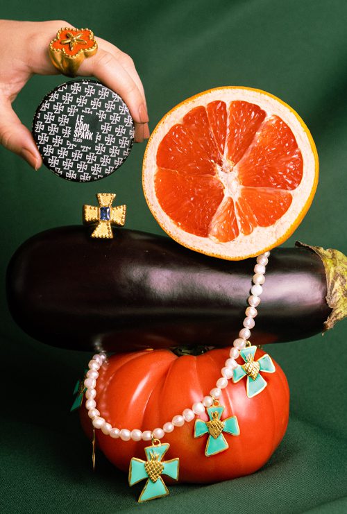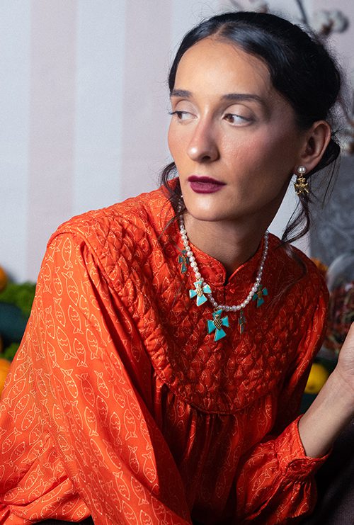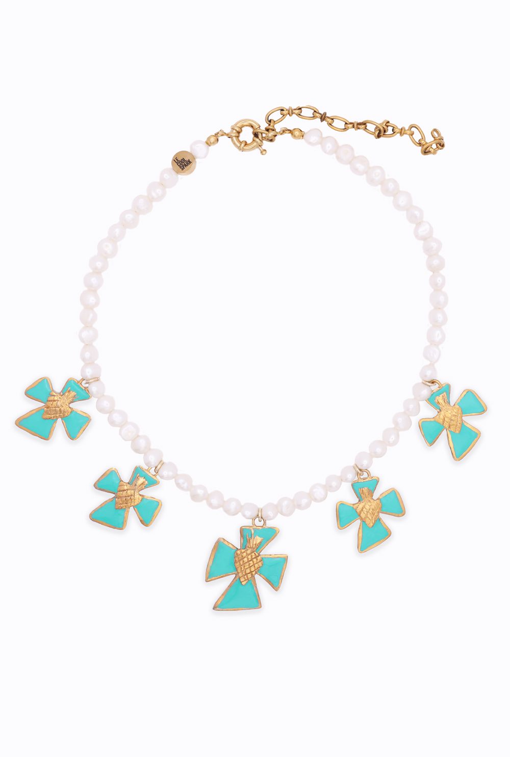 El collar Bloom está elaborado con perlas de agua dulce y cruces bañadas en 3 micras de oro de 24 quilates, esmaltadas en un intenso azul turquesa. Su nombre —Bloom, que en inglés significa “florecer”— evoca la manera en que las cruces aparecen a lo largo del collar como flores que brotan, llenas de vida y movimiento.