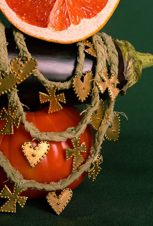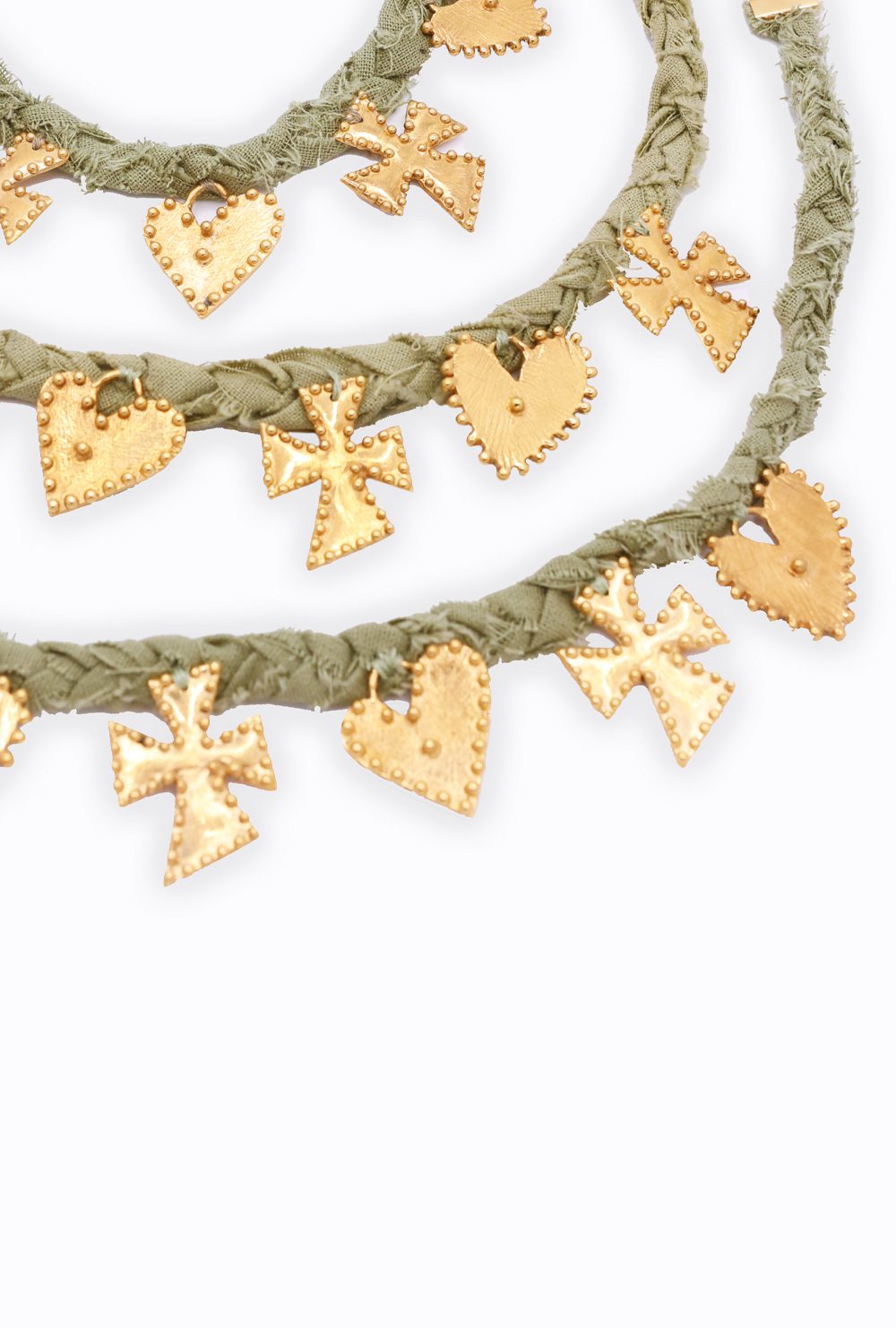 El Collar Spira es una pieza artesanal cuidadosamente elaborada a mano con cordón de algodón entrelazado color verde menta, adornado con 19 figuras de cruces y corazones talladas a mano y bañadas con 3 micras de oro de 24 quilates.