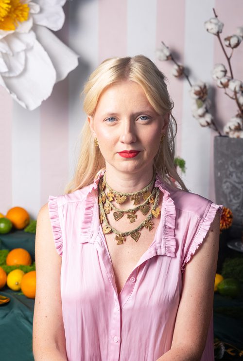 Su nombre proviene del latín spira —espiral— evocando el movimiento envolvente de su diseño, que se adapta al cuello con natural elegancia. Las cuerdas doradas, entrelazadas con delicados corazones y cruces, caen suavemente, recordando la caída hipnótica de Alicia por la madriguera: un viaje onírico hacia lo desconocido, donde lo inesperado se transforma en maravilla.